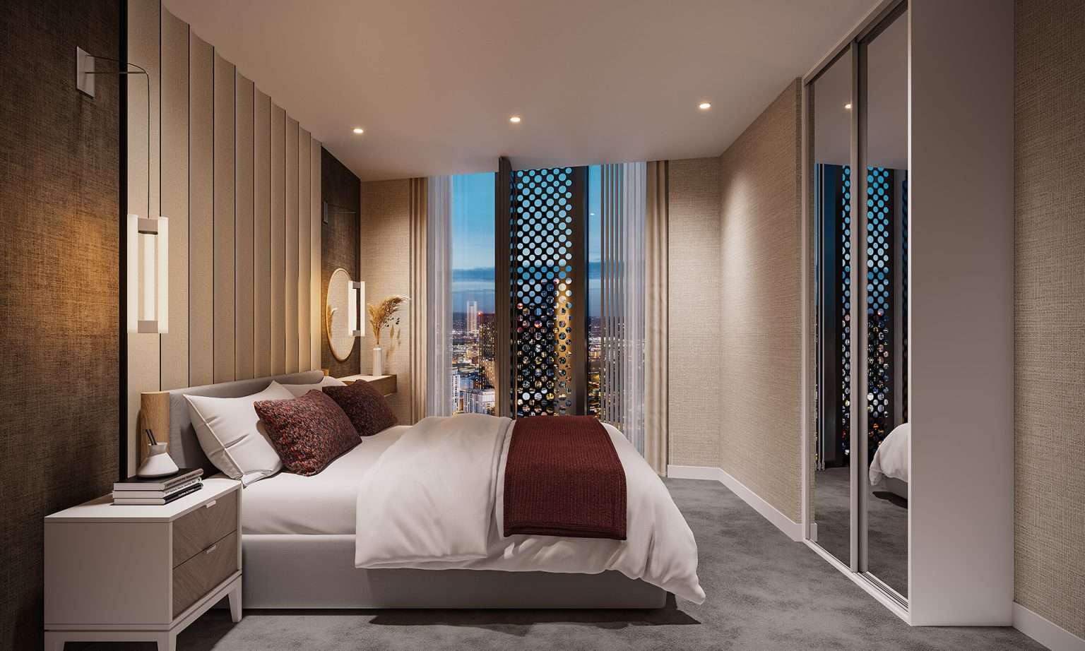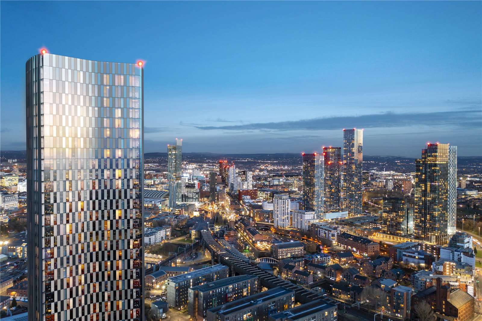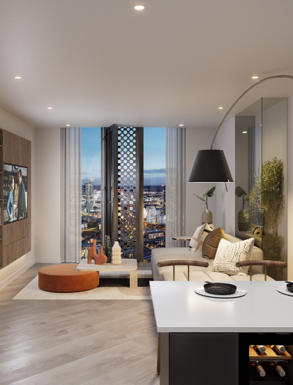 Vista River Gardens 是一座高 55 层的当代豪华地标,巍然耸立于曼彻斯特Trinity Island 的历史名河River Irwell 河畔。这座建筑杰作拥有迷人的几何设计,其造型灵感源自河流优雅的曲线,为城市天际线勾勒出动感的轮廓。
